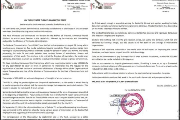 In a recent development that has raised concerns about press freedom in Cameroon, the Cameroon Journalist Trade Union (CJTU) has issued a strong condemnation against the increasing threats and intimidations journalists face. This statement comes at a critical time when the role of the press is more important than ever in fostering transparency and accountability….