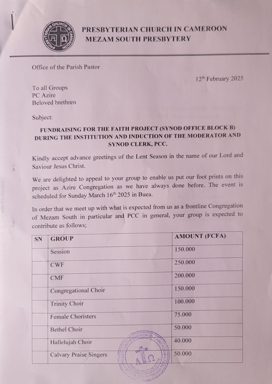He needs an apartment to settle there. To begin with, have they occupied all of block A? . All KPs’ and their families cannot occupy that block A. They are just looking for ways to put money in their pockets. I don’t think building houses have anything to do with the spiritual life of PCC Christians. Satan’s load is on many, and they need another Moses to help them out of this trauma. Fonki advised to leave the Synod premises